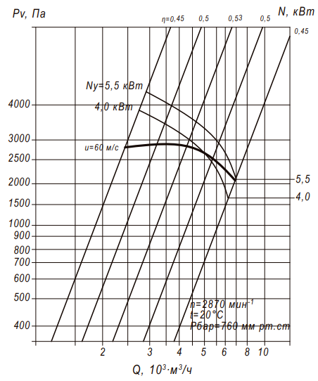 dust fanFor relatively simple pneumatic transport systems with a total tract length of up to 20 meters (65 feet), typical dust fans like the VCP 7-40 are used. They have a few blades arranged strictly in a radial direction, which allows dust that accumulates to constantly fall off the blades, achieving self-cleaning. Most of these fans can create a vacuum of 2500 Pa (0.36 psi), which is sufficient to overcome the combined resistance of the ducts with bends and a cyclone. It's usually best to operate fans close to their maximum pressure where the efficiency exceeds 50%. As shown in the VCP 7-40 №4 graph, this range is between 3500 and 5500 m³/h (2060 and 3240 cfm). From the graph, we can also determine that the actual power consumption of the motor will be between 2.5 and 4 kW (3.4 to 5.4 hp). The maximum load on the fan motor occurs at minimal duct resistance when the fan moves the maximum possible mass of air, which for this model is 7000 m³/h (4120 cfm) at 5.5 kW (7.4 hp).